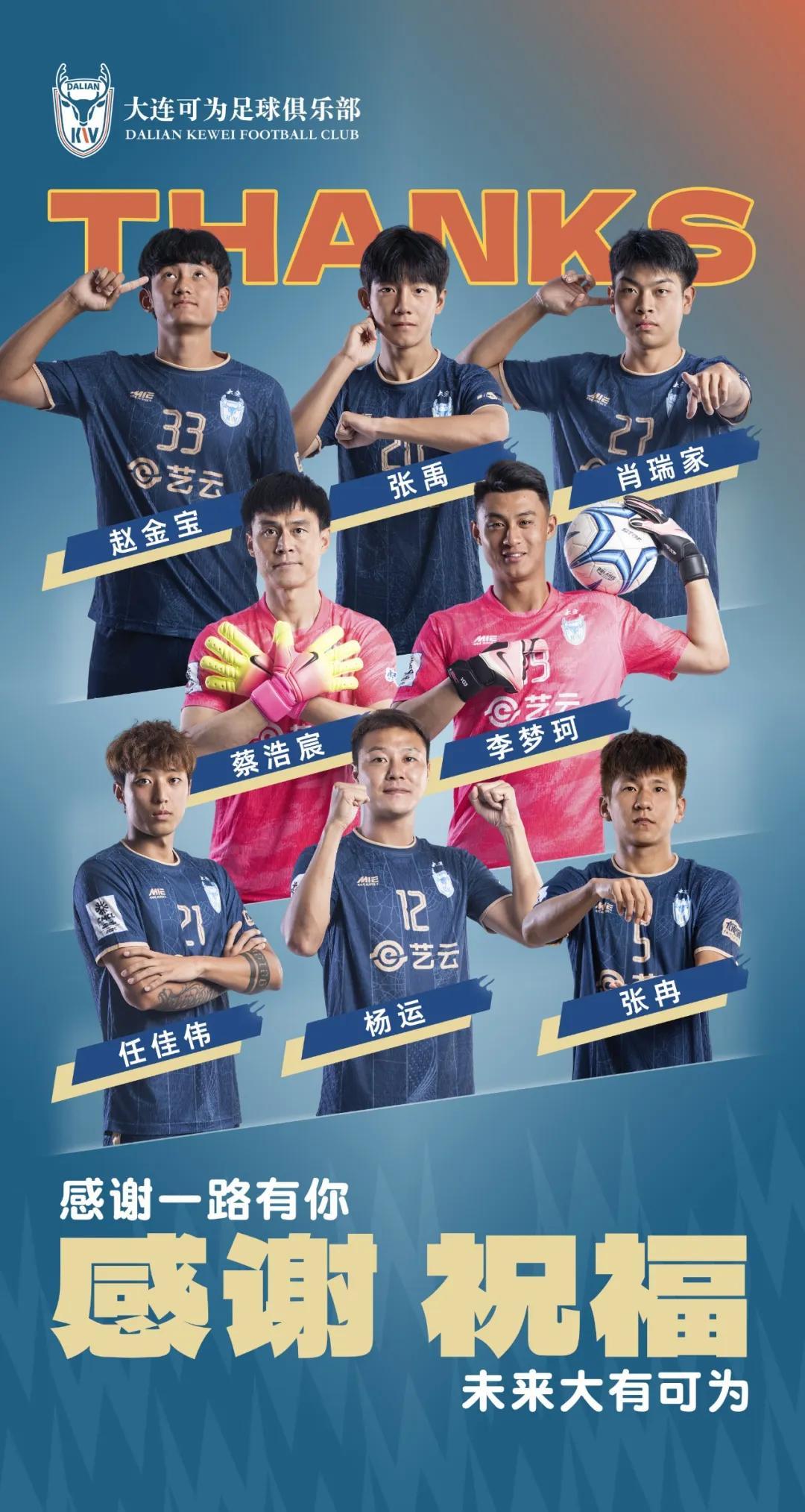 我们共同经历了大区赛的欣喜,也经历了淘汰赛冲乙的激动。在大连可为的成长过程中,你们的贡献是不可磨灭的。你们为团队注入了力量与勇气,那些共同奋斗的日夜,那些互相扶持的瞬间,早已刻进这支队伍的骨骼与血脉之中。但足球就是这样,希望这一次的离别,是为了我们将来的顶峰相见。